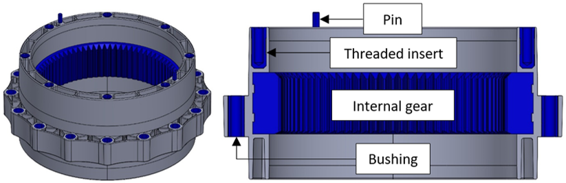 After analyzing the results, we made a conclusion, that the hybrid housing would be the most optimal solution for semi-serial production. In this case, the more loaded parts, such as gear ring, bushings, threaded inserts, will remain metal, while the rest of the housing will be made of plastic material.
