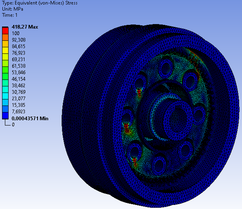 We created a numerical simulation (FEM analysis) of the entire original drive, which we slightly simplified for this purpose. Simplification did not affect the functions of the drive unit, but we only removed geometrically irregular shapes (e.g. technological details). Most of the housing showed low equivalent stresses, which confirms it as a right component for hybridization, while the other components are subjected to significantly higher stresses and are thus less suitable for material replacement.